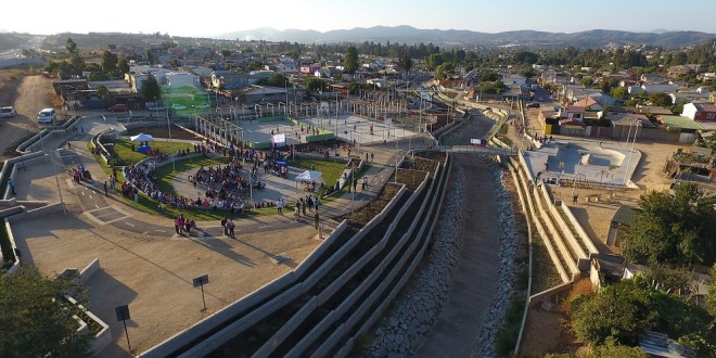 Quebrada del estero existente, dando un valor al espacio con un diseño arquitectónico que incluye áreas de esparcimiento deportivo, zonas multiuso, áreas verdes, terrazas y jardines, juegos infantiles, áreas de descanso, estaciones y senderos temáticos, estacionamientos, Skate Park, cancha de fútbol, y accesibilidad universal para personas en situación de discapacidad y adultos mayores, fue ejecutado por el SERVIU a través del Plan de Construcción de Parques Urbanos del Ministerio de Vivienda y Urbanismo.